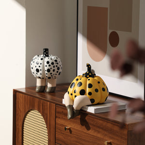 Quirky, bold, and full of character—*Dottie Pumpkin* is a playful fusion of modern art and whimsy. With polka-dot patterns and charming little legs, this statement piece brings a unique charm to any contemporary space.