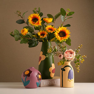 A set of artistic ceramic vases featuring hand-painted floral designs, blending earthy tones and vibrant accents for a lively and elegant decor.
