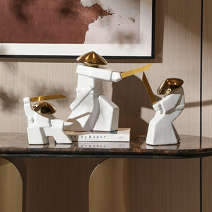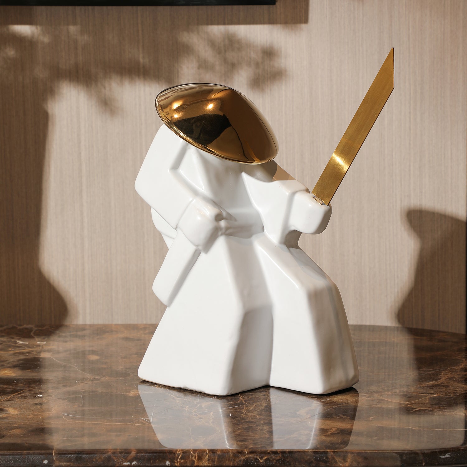 Little Warrior sculptures capture the essence of discipline and valor in a modern, abstract form. With bold geometric silhouettes in glossy white and striking gold accents on their helmets and swords, these figures evoke the timeless spirit of the samurai. Perfect for contemporary interiors, they symbolize strength, honor, and the balance between power and elegance.