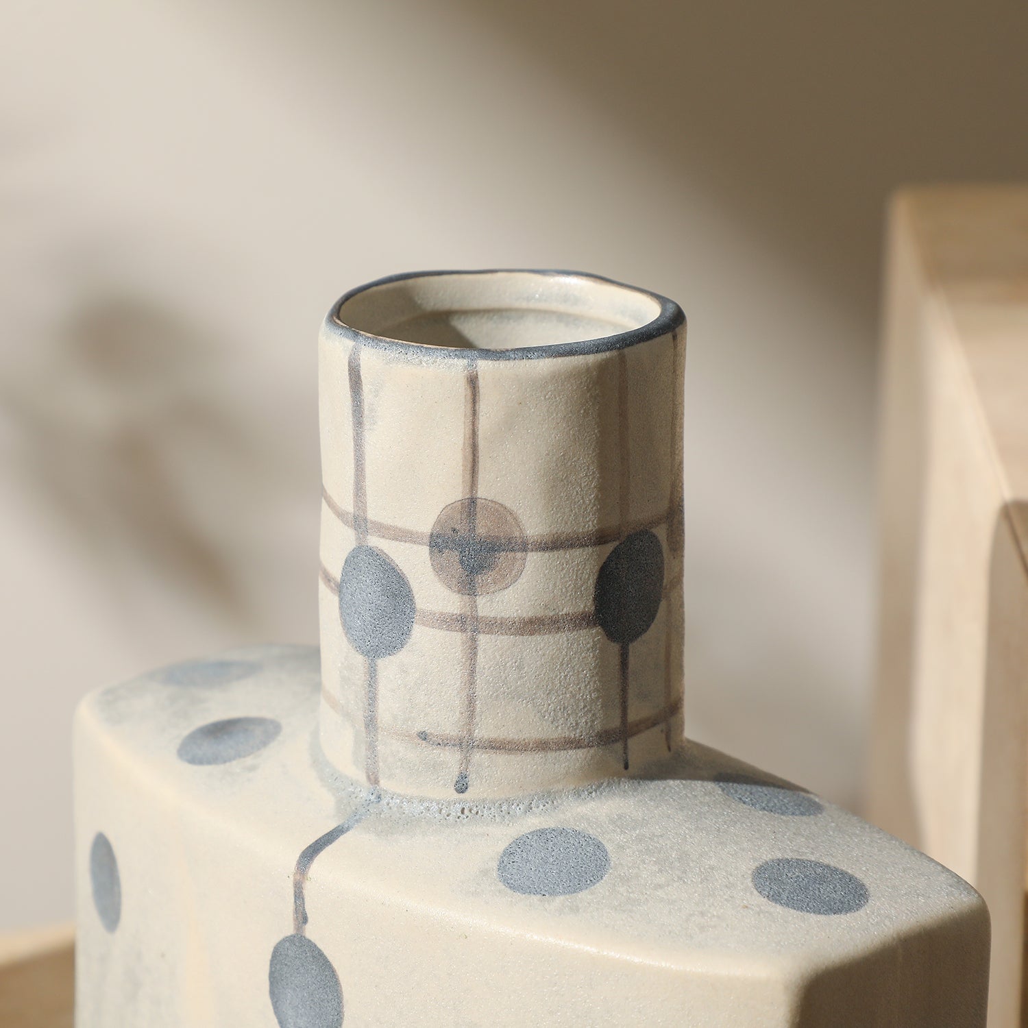 Inspired by the elegance of mosaic artistry, the Mosaic Echo Vases embody a seamless blend of geometric precision and artistic charm. The interplay of soft-toned tiles, arranged in polka dot and structured grid patterns, creates a striking visual contrast reminiscent of classic mosaic work. With their structured silhouettes and textured finish, these vases exude a refined, architectural aesthetic, making them the perfect statement pieces for contemporary and minimalistic interiors.