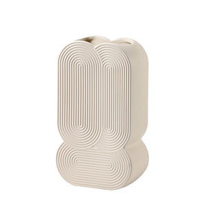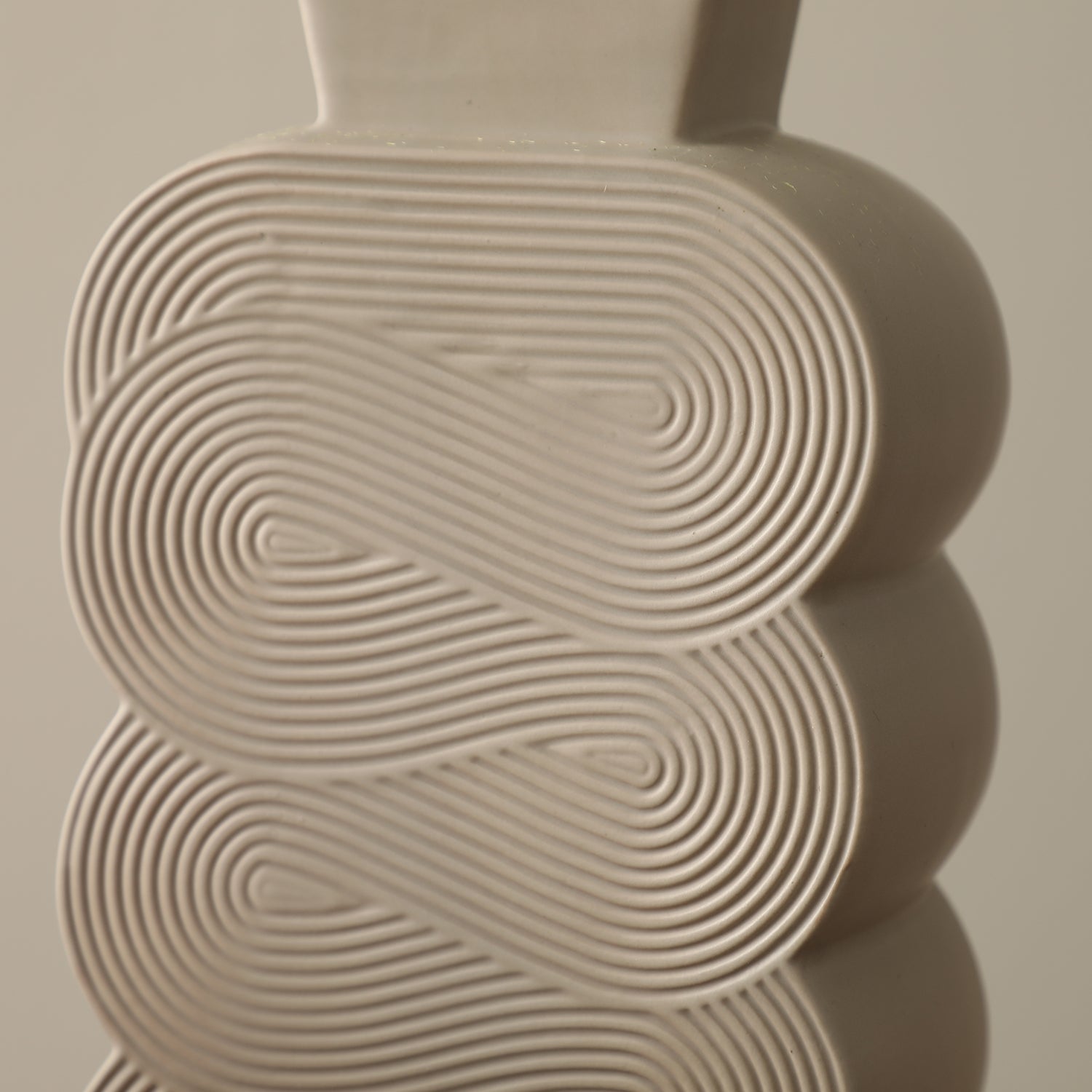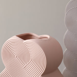 The Orbit Bloom Vase showcases a unique geometric silhouette adorned with mesmerizing concentric patterns. Its sculptural form, available in muted pastel tones, adds a touch of modern elegance, making it a statement piece for contemporary interiors.