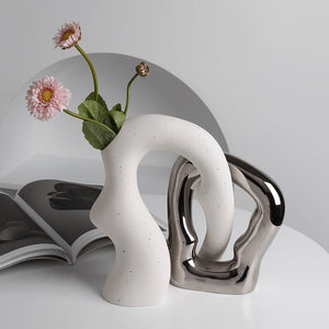 A captivating pair of abstract vases featuring fluid, organic shapes with a contrast of sleek chrome and speckled ceramic. These modern art-inspired pieces add depth and sophistication to any contemporary space.