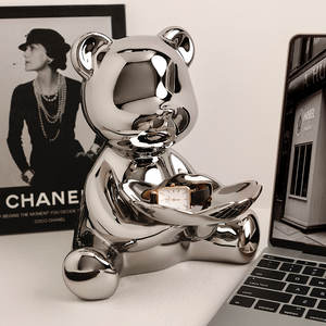 A sleek, metallic silver bear figurine with a small tray, ideal for holding jewelry, keys, or decorative items with a modern touch.