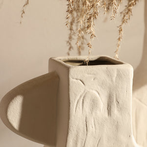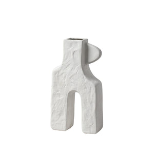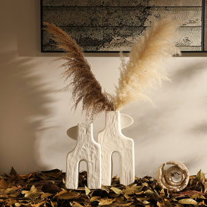 The Terra Arc Vase embodies a fusion of organic textures and sculptural design. With its arch-like silhouette and earthy, handcrafted finish, it brings a raw yet refined aesthetic to any space, making it a perfect statement piece for modern and minimalist interiors.