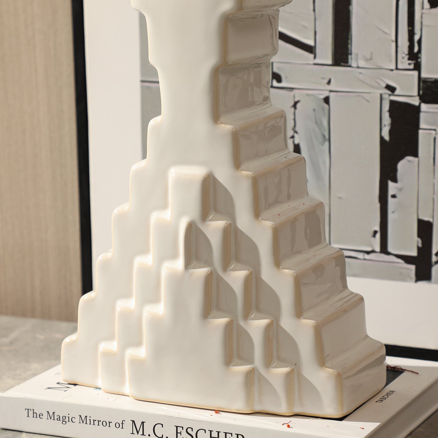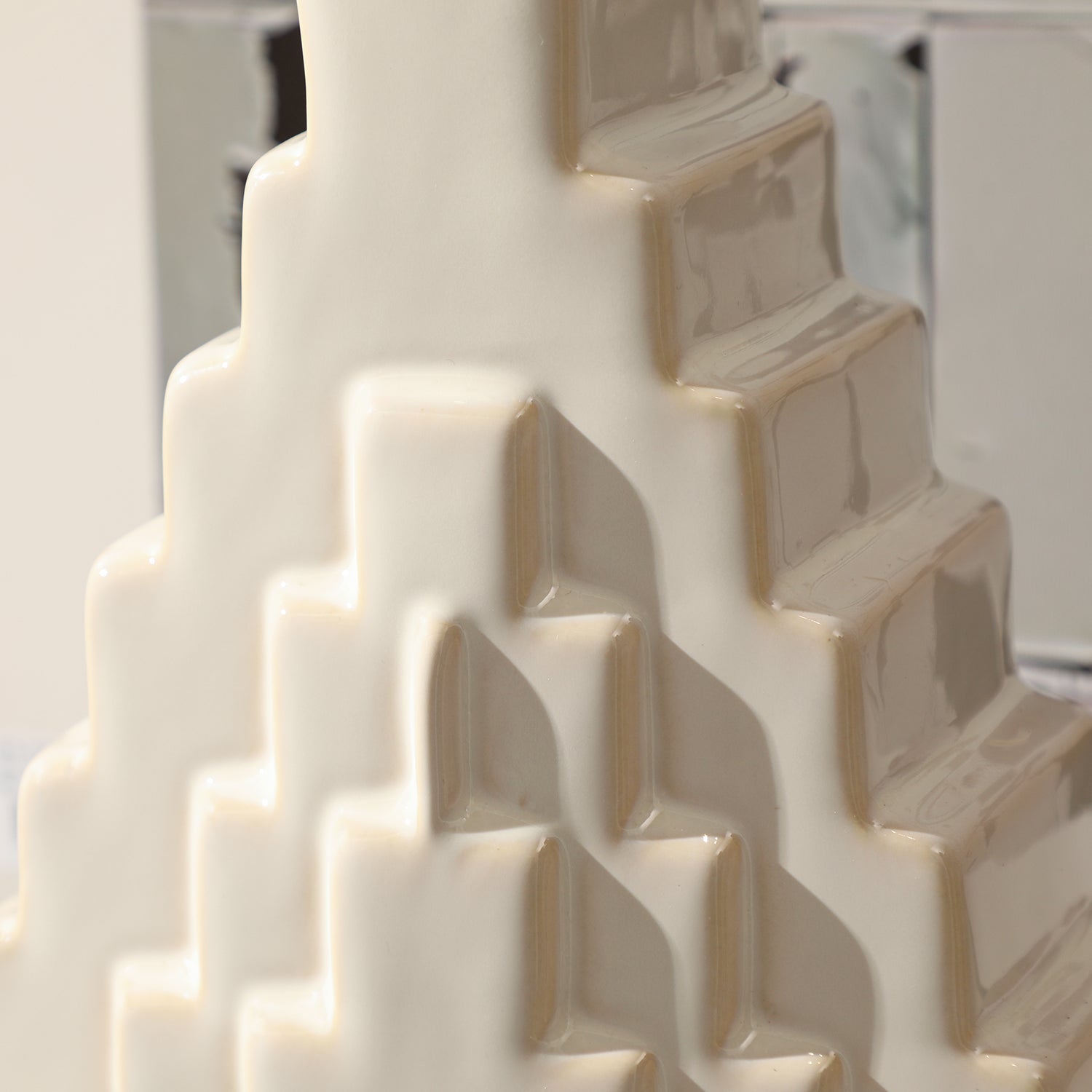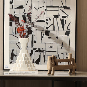 Inspired by architectural grandeur, the Zenith Staircase Vase features a striking tiered design reminiscent of ancient step pyramids. Its sculptural elegance and minimalist white finish make it a captivating statement piece, perfect for modern interiors.